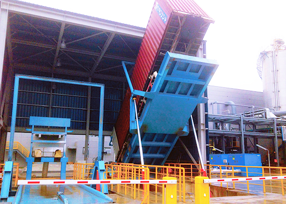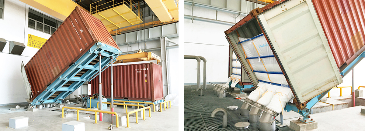 用液壓翻轉(zhuǎn)裝置把集裝箱豎起來, 從頂部充填。